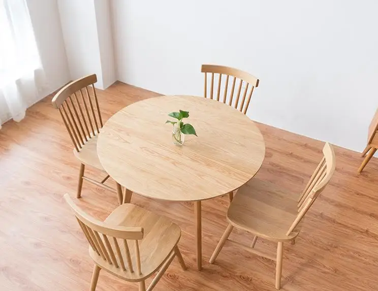 Деревянные стулья с черными крестообразными спинками стоят вокруг белого круглого обеденного стола.