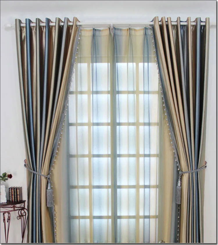 Изысканно и модно выглядит чередование блестящих и матовых, однотонных и узорчатых полос, узких и широких полос из различных тканей. Изменяют направление полос и угол драпировки используя подхваты, магниты или другие фиксирующие аксессуары.
